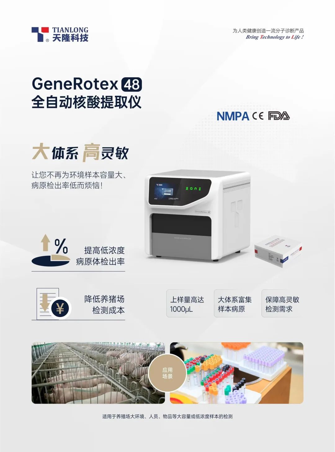 天隆科技的非洲豬瘟病毒核酸檢測試劑(熒光PCR法)獲得泰國醫(yī)療器械TFDA注冊(cè)認(rèn)證,配套儀器GeneRotex 48 和NP968-C也獲得了NMPA、CE、FDA醫(yī)療器械認(rèn)證。其中,GeneRotex 48全自動(dòng)核酸提取儀及配套試劑,上樣量高達(dá)1000uL,大體系富集樣本病原,能保障高靈敏檢測需求。該提取系統(tǒng)可提高低濃度病原體檢出率、降低養(yǎng)豬場檢測成本,特別適用于養(yǎng)殖場大環(huán)境、人員、物品樣本和豬鼻(咽)拭子、血液等大容量或低濃度樣本的檢測。